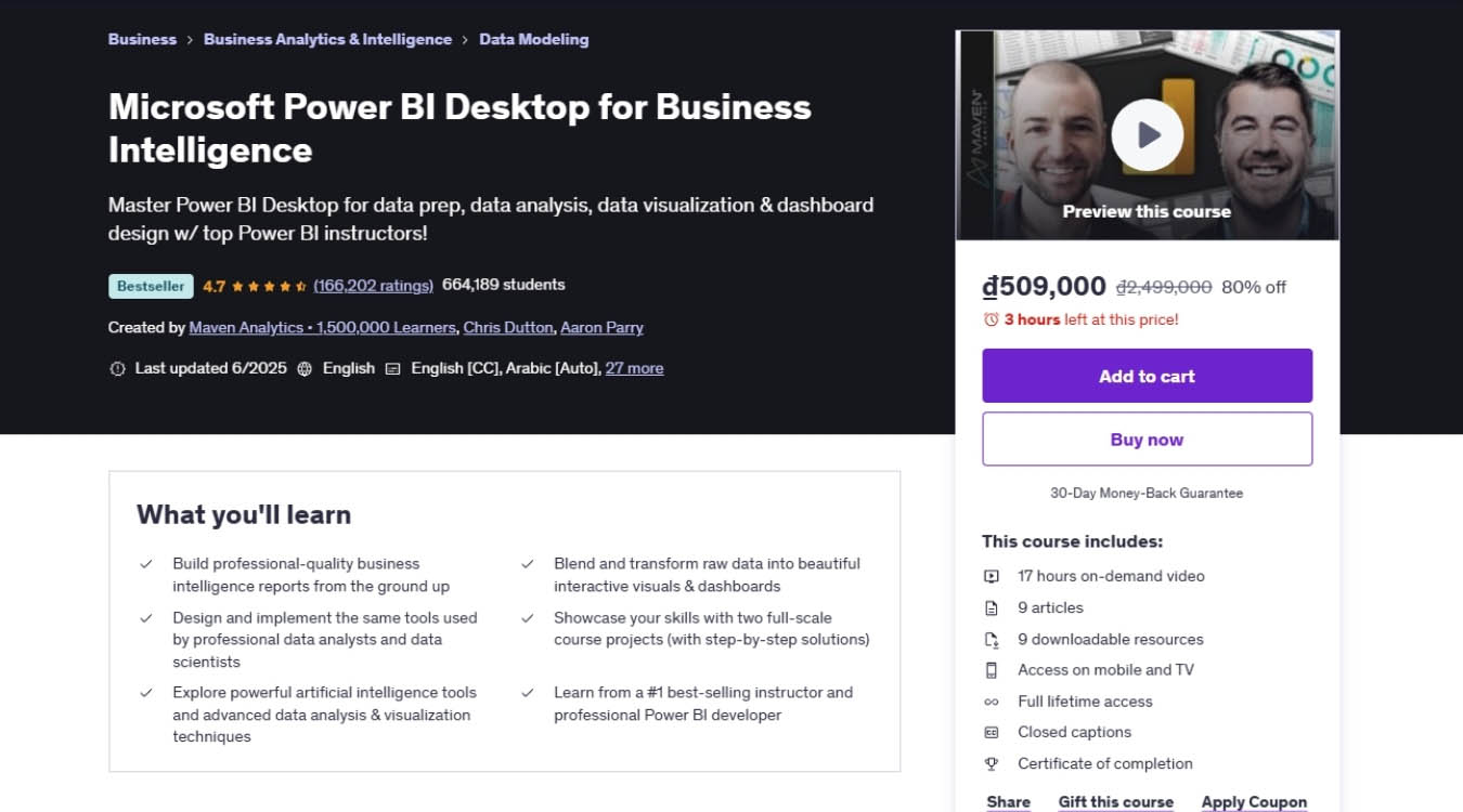 Microsoft Power BI Desktop for Business Intelligence trên Udemy, được giảng dạy bởi Maven Analytics, là một trong những khóa học Power BI online phổ biến nhất với hơn 100.000 học viên. Khóa học này nổi bật bởi sự toàn diện và tính ứng dụng cao. Các bài giảng video được quay chuyên nghiệp, kết hợp lý thuyết và thực hành. Các dự án thực tế, như xây dựng dashboard doanh thu cho công ty bán lẻ, được học viên đánh giá cao vì tính ứng dụng.